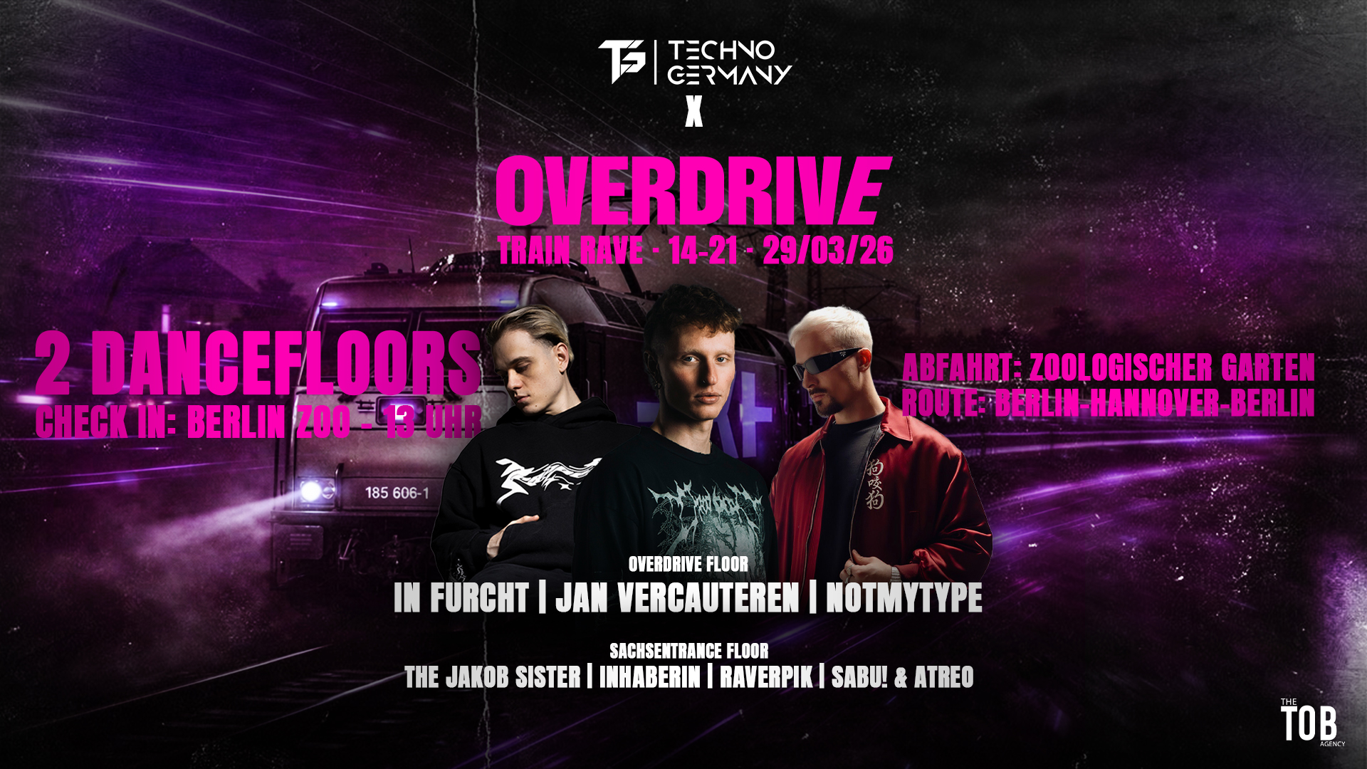 - 🚆⚡ OVERDRIVE – TRAIN RAVE ⚡🚆 Wenn Stillstand keine Option ist. Am 29.03.26 wird der Zug selbst zur Tanzfläche. Ein rollender Ausnahmezustand zwischen Berlin & Hannover – roh, laut, kompromisslos. 🔥 2 DANCEFLOORS ⚙️ treibender Techno 🔊 kompromissloser Overdrive-Sound ⏱️ 14 – 21 Uhr 📍 Check-In: Berlin Zoo – 13 Uhr 🚉 Abfahrt: Zoologischer Garten Berlin 🛤️ Route: Berlin → Hannover → Berlin 🎧 LINEUP: SECRET Keine Namen. Kein Hype. Nur Sound. 🎟️ JETZT TICKETS SICHERN Plätze streng limitiert.